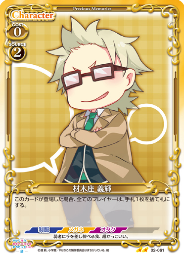 | このカードが登場、または退場した場合、キャラ1枚は、ターン終了時まで使用コスト+2、+20/±0を得る。 | ||