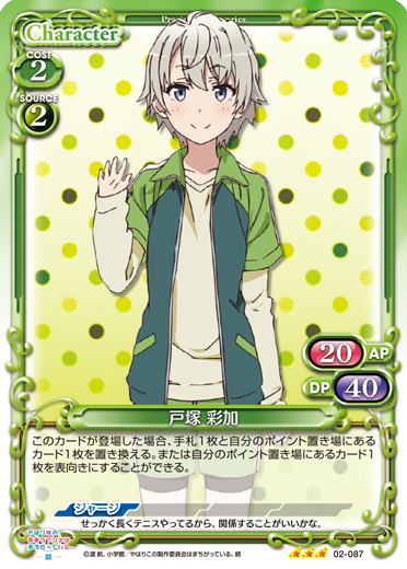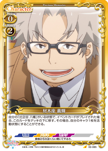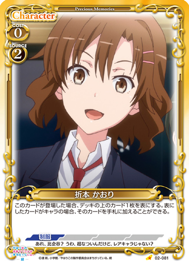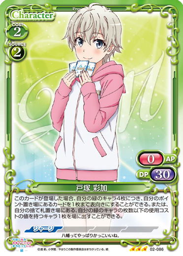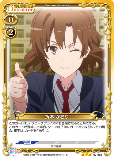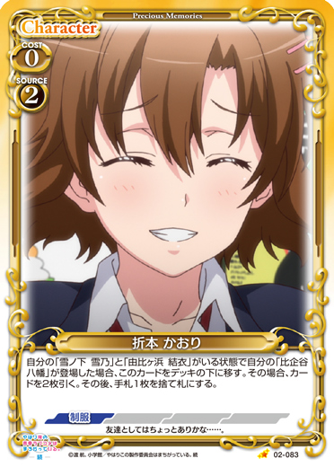 | 自分の「雪ノ下 雪乃」と「由比ヶ浜 結衣」がいる状態で自分の「比企谷 八幡」が登場した場合、このカードをデッキの下に移す。その場合、カードを2枚引く。その後、手札1枚を捨て札にする。 | ||