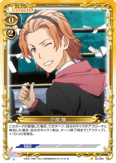 | このカードが登場した場合、このターン、自分のキャラがアプローチに参加した場合、自分のキャラ1枚は、ターン終了時まで〔アクティブ〕、+10/±0を得る。 | ||