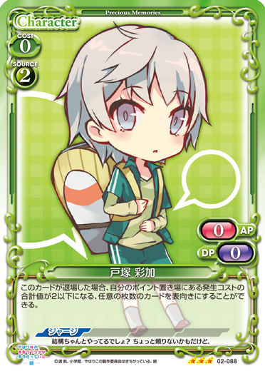 | このカードが退場した場合、自分のポイント置き場にある発生コストの合計値が2以下になる、任意の枚数のカードを表向きにすることができる。 | ||
