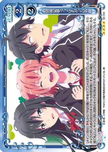 | このカードが登場した場合、デッキの上のカード4枚を見て、その中にある『やはり俺の青春ラブコメはまちがっている。続』のイベントカード1枚を抜き出し、表にしてから手札に加える。その後、残りのカードを任意の順番でデッキの下に移す。 | ||