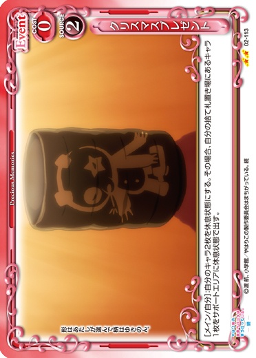 | [メイン/自分]:自分のキャラ2枚を休息状態にする。その場合、自分の捨て札置き場にあるキャラ1枚をサポートエリアに休息状態で出す。 | ||