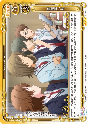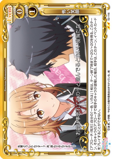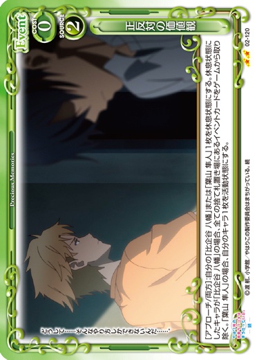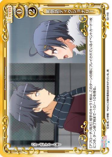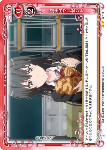 | [アプローチ/両方]:自分の「比企谷 八幡」または「葉山 隼人」1枚を休息状態にする。休息状態にしたキャラが「比企谷 八幡」の場合、全ての捨て札置き場にあるイベントカードをゲームから取り除く。「葉山 隼人」の場合、自分のキャラ1枚を活動状態にする。 | ||
