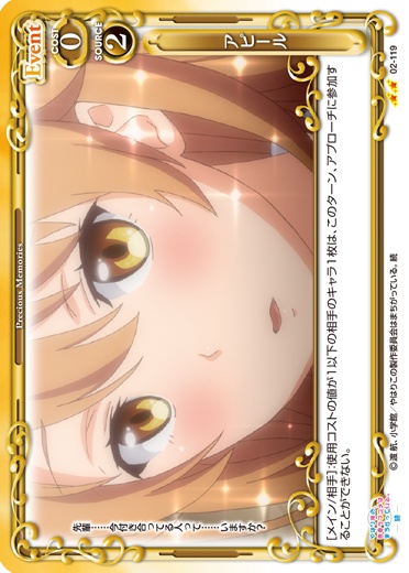 | [アプローチ/両方]:自分の「一色 いろは」1枚は、ターン終了時まで+20/+20を得る。このターン、そのキャラのアプローチで相手のキャラが退場した場合、相手は、このターン、イベントカードをプレイすることができない。 | ||