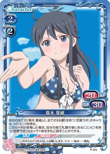 | 自分の全ての「真木 夏緒」と、全ての【水着】を持つ『恋愛ラボ』のキャラは、±0/+10を得る。 このカードが登場した場合、自分の捨て札置き場にある〔コンビ〕を持つ『恋愛ラボ』のキャラ1枚を手札に戻すことができる。 | ||