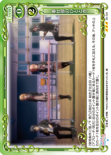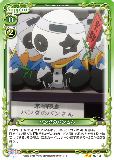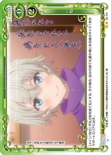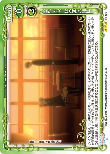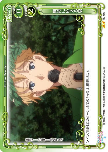 | [メイン/自分]:手札2枚を捨て札にする。その場合、自分の捨て札置き場にある緑のキャラ1枚をサポートエリアに出す。 | ||