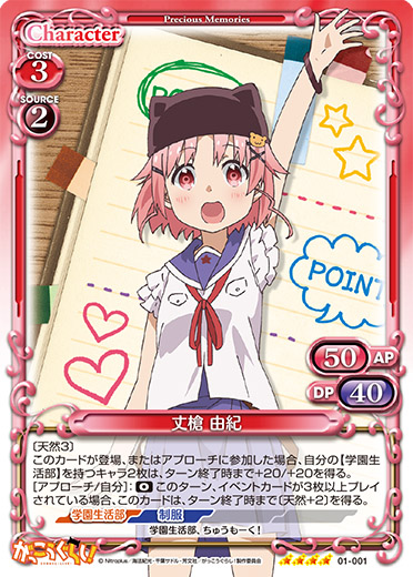 | 〔天然3〕このカードが登場、またはアプローチに参加した場合、自分の【学園生活部】を持つキャラ2枚は、ターン終了時まで+20/+20を得る。[アプローチ/自分]:《0》このターン、イベントカードが3枚以上プレイされている場合、このカードは、ターン終了時まで〔天然+2〕を得る。 | ||