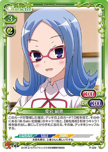 | このカードが登場した場合、デッキの上のカード10枚を見て、その中にある『咲-Saki-全国編』のキャラ1枚と、【姫松高校】を持つキャラ1枚を抜き出し、表にしてから手札に加える。その後、デッキをシャッフルする。 | ||
