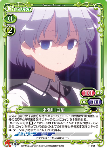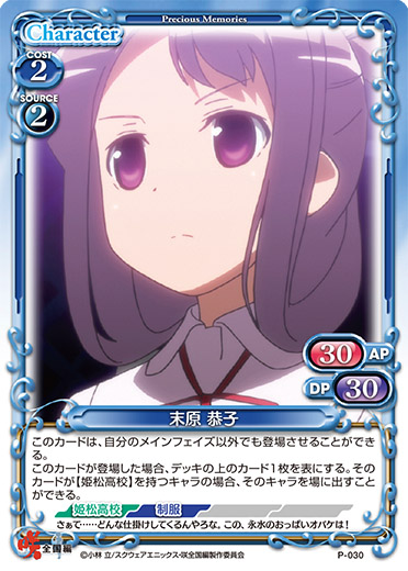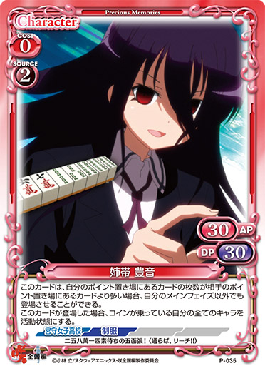 | このカードは、自分のメインフェイズ以外でも登場させることができる。このカードが登場した場合、デッキの上のカード1枚を表にする。そのカードが【姫松高校】を持つキャラの場合、そのキャラを場に出すことができる。 | ||