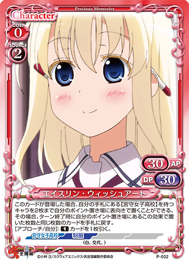 | このカードは、自分のポイント置き場にあるカードの枚数が相手のポイント置き場にあるカードより多い場合、自分のメインフェイズ以外でも登場させることができる。このカードが登場した場合、コインが乗っている自分の全てのキャラを活動状態にする。 | ||