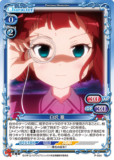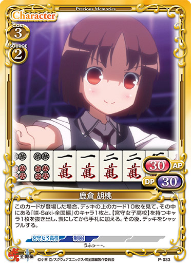 | このカードが登場した場合、デッキの上のカード10枚を見て、その中にある『咲-Saki-全国編』のキャラ1枚と、【宮守女子高校】を持つキャラ1枚を抜き出し、表にしてから手札に加える。その後、デッキをシャッフルする。 | ||
