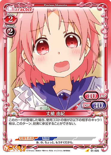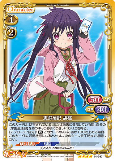 | このカードは、妨害されている、または妨害に参加している間、自分の【学園生活部】を持つキャラ2枚につき、+10/±0を得る。[アプローチ/自分]:《0》このカードのAPの値が100以上ある場合、このカードは、活動状態になるとともに、次のターン終了時まで退場しない。 | ||