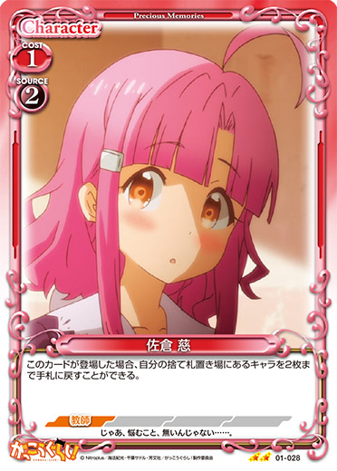 | このカードが登場した場合、自分の捨て札置き場にあるキャラを2枚まで手札に戻すことができる。 | ||