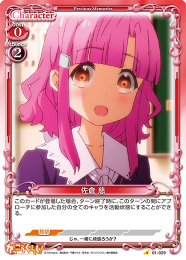 | このカードが登場した場合、ターン終了時に、このターンの間にアプローチに参加した自分の全てのキャラを活動状態にすることができる。 | ||