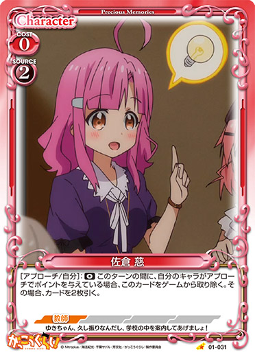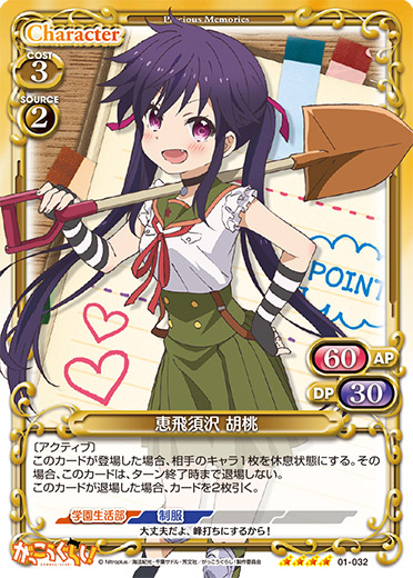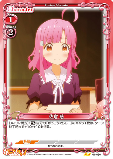 | [メイン/両方]:《休》自分の『がっこうぐらし!』のキャラ1枚は、ターン終了時まで+10/+10を得る。 | ||