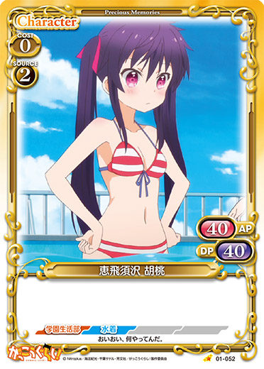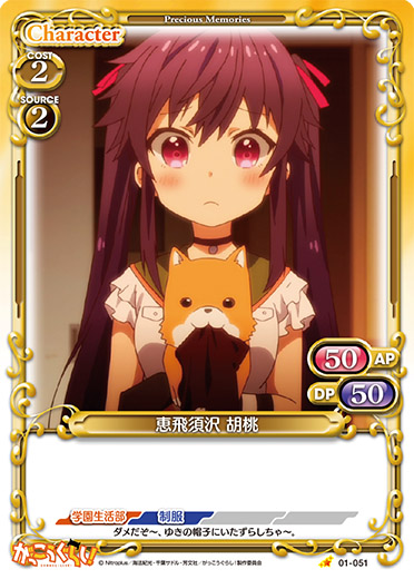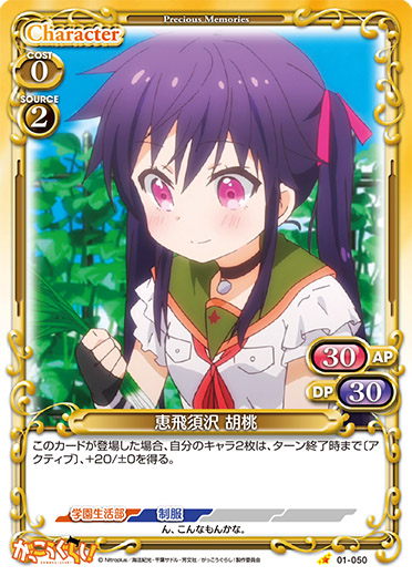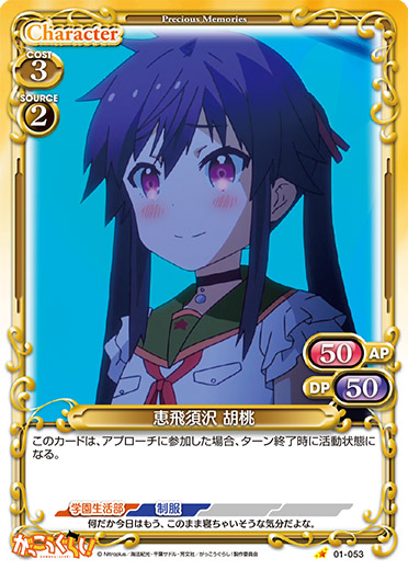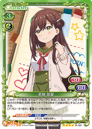 | このカードが登場、またはアプローチに参加した場合、ターン終了時に自分の【学園生活部】を持つキャラを2枚まで活動状態にすることができる。[アプローチ/相手]:《3》カードを2枚引く。 | ||