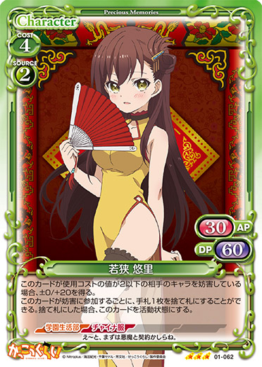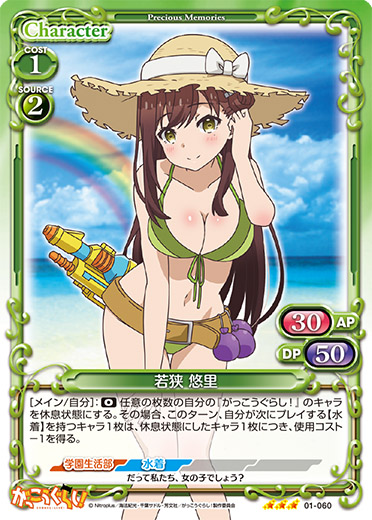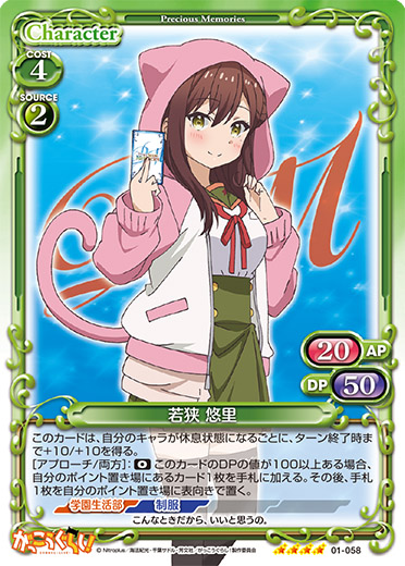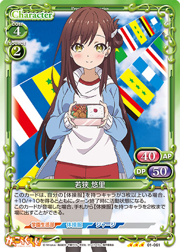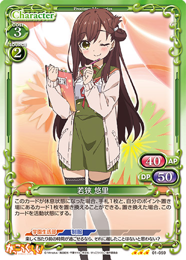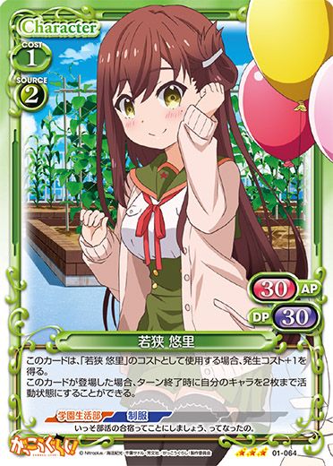 | このカードは、「若狭 悠里」のコストとして使用する場合、発生コスト+1を得る。このカードが登場した場合、ターン終了時に自分のキャラを2枚まで活動状態にすることができる。 | ||