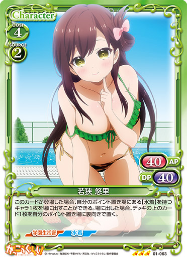 | このカードが登場した場合、自分のポイント置き場にある【水着】を持つキャラ1枚を場に出すことができる。場に出した場合、デッキの上のカード1枚を自分のポイント置き場に裏向きで置く。 | ||
