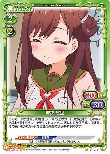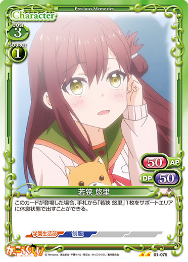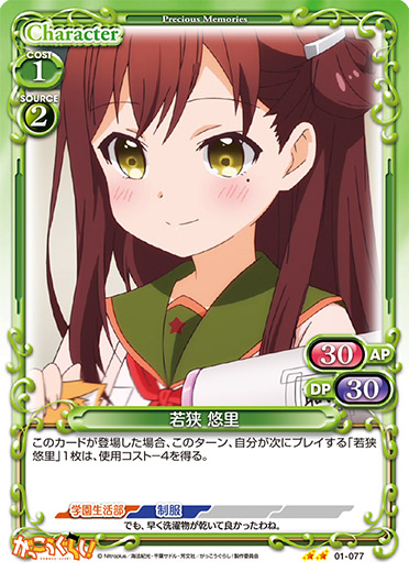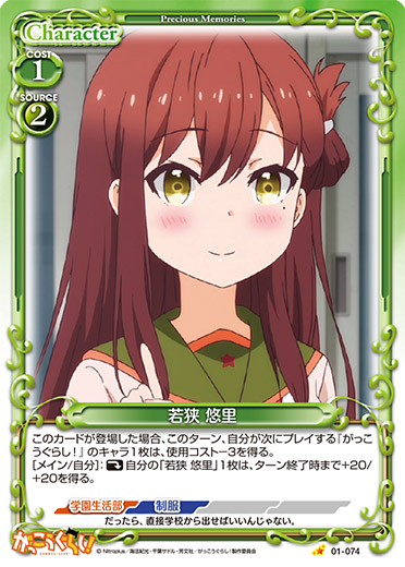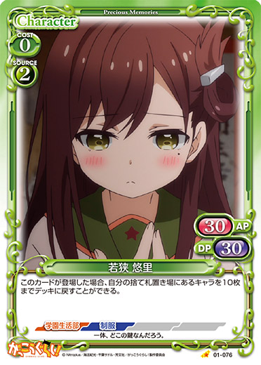 | このカードが登場した場合、このターン、自分が次にプレイする「若狭 悠里」1枚は、使用コスト-4を得る。 | ||