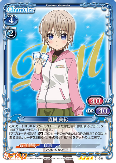 | このカードは、キャラがアプローチまたは妨害に参加するごとに、ターン終了時まで±0/+10を得る。[アプローチ/両方]:《0》このカードのAPまたはDPの値が100以上ある場合、カードを2枚引く。その後、手札1枚をデッキの上に戻す。 | ||