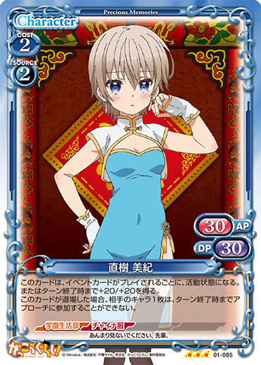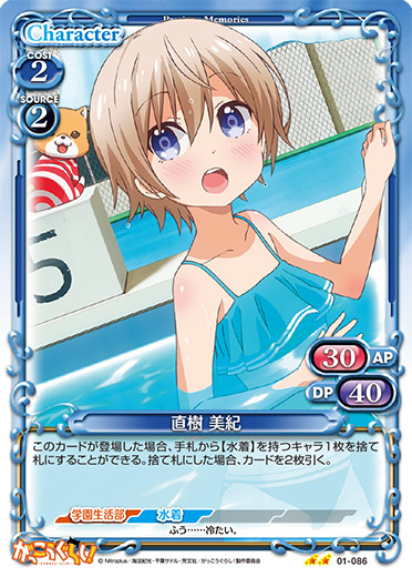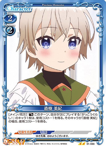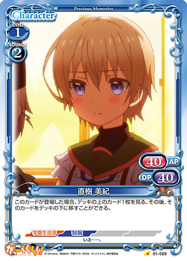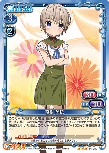 | このカードは、「直樹 美紀」のコストとして使用する場合、発生コスト+1を得る。このカードが登場した場合、カードを2枚引く。その後、手札2枚を任意の順番でデッキの下に移す。 | ||