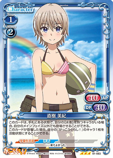 | このカードは、手札にある状態で、自分の【水着】を持つキャラがいる場合、自分のメインフェイズ以外でも登場させることができる。このカードが登場した場合、自分の『がっこうぐらし!』のキャラ1枚を活動状態にすることができる。 | ||