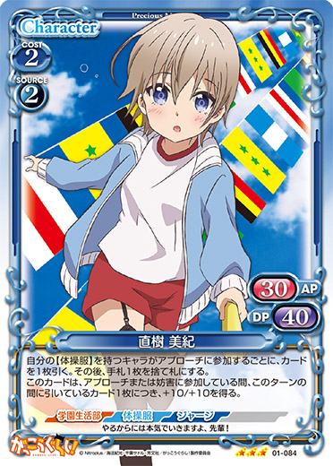 | 自分の【体操服】を持つキャラがアプローチに参加するごとに、カードを1枚引く。その後、手札1枚を捨て札にする。このカードは、アプローチまたは妨害に参加している間、このターンの間に引いているカード1枚につき、+10/+10を得る。 | ||