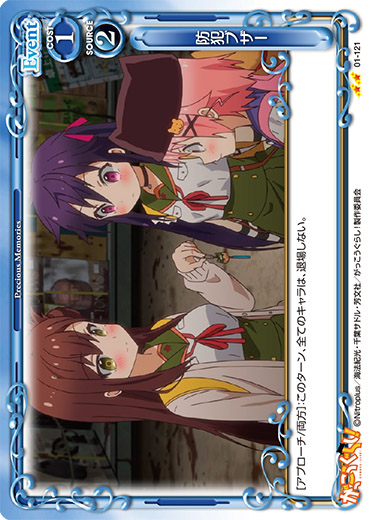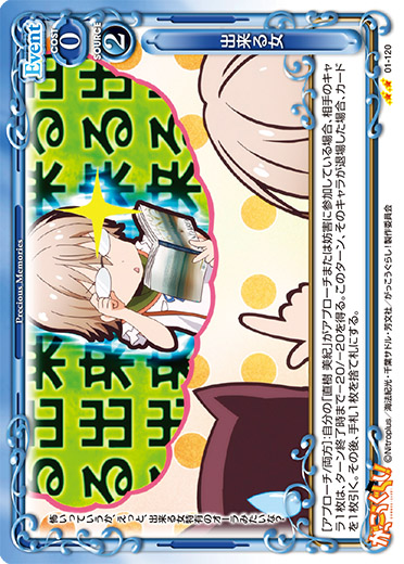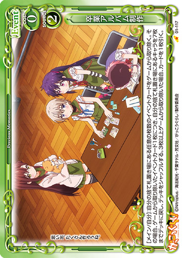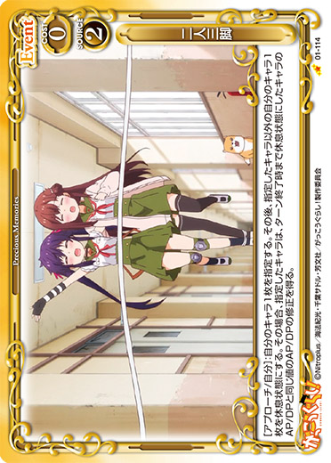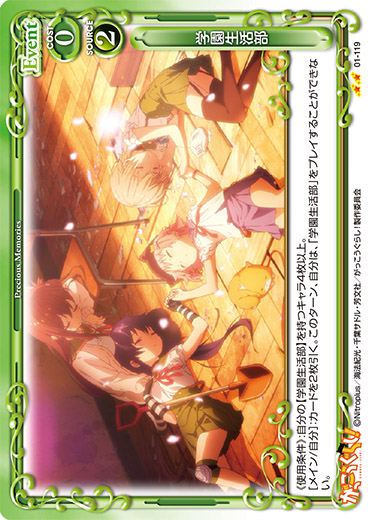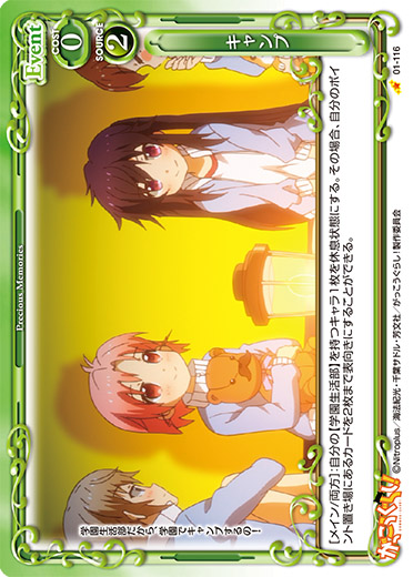 | 《使用条件》:自分の【学園生活部】を持つキャラ4枚以上。[メイン/自分]:カードを2枚引く。このターン、自分は、「学園生活部」をプレイすることができない。 | ||