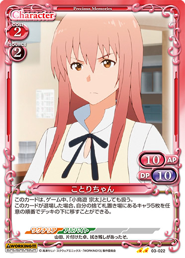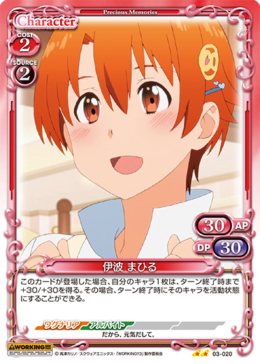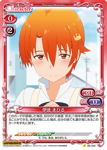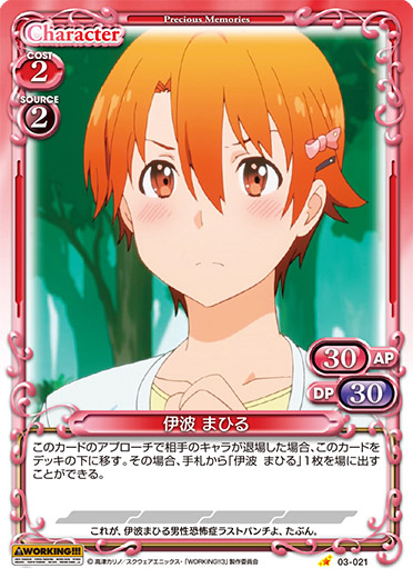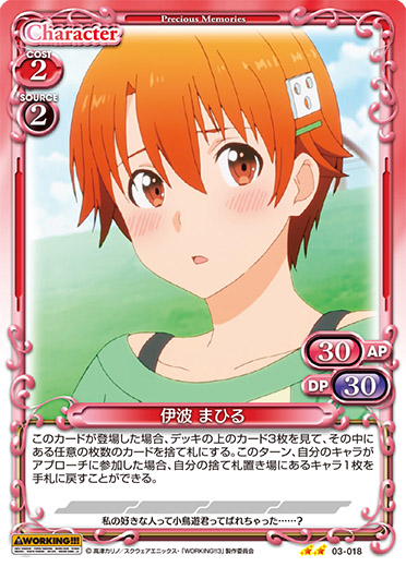 | このカードのアプローチで相手のキャラが退場した場合、このカードをデッキの下に移す。その場合、手札から「伊波 まひる」1枚を場に出すことができる。 | ||