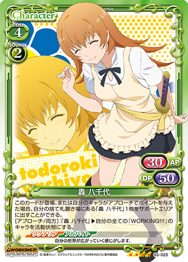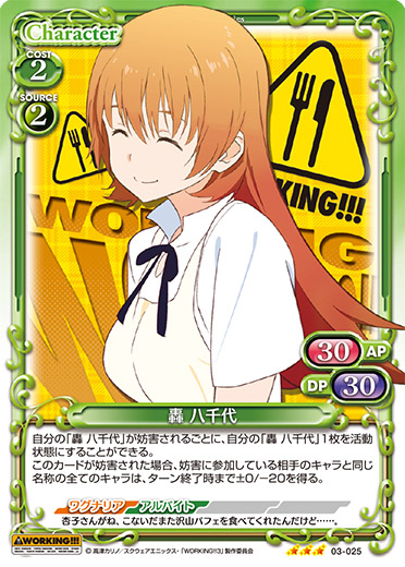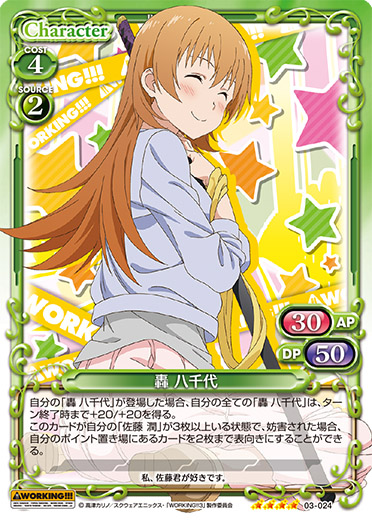 | このカードが登場、または自分のキャラがアプローチでポイントを与えた場合、自分の捨て札置き場にある「轟 八千代」1枚をサポートエリアに出すことができる。[アプローチ/両方]:「轟 八千代」▸自分の全ての『WORKING!!!』のキャラを活動状態にする。 | ||