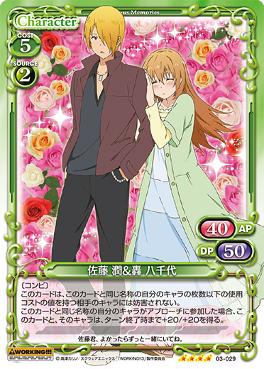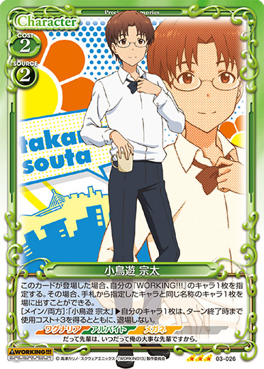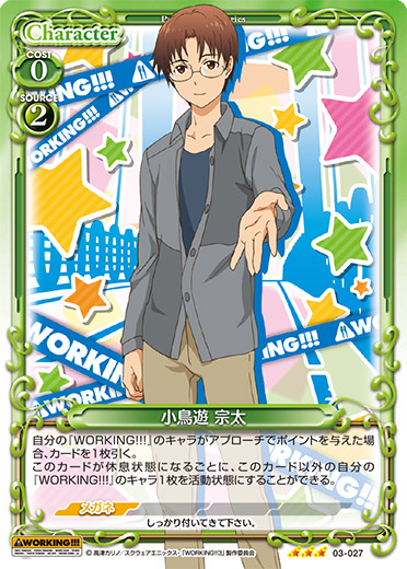 | 自分の『WORKING!!!』のキャラがアプローチでポイントを与えた場合、カードを1枚引く。このカードが休息状態になるごとに、このカード以外の自分の『WORKING!!!』のキャラ1枚を活動状態にすることができる。 | ||