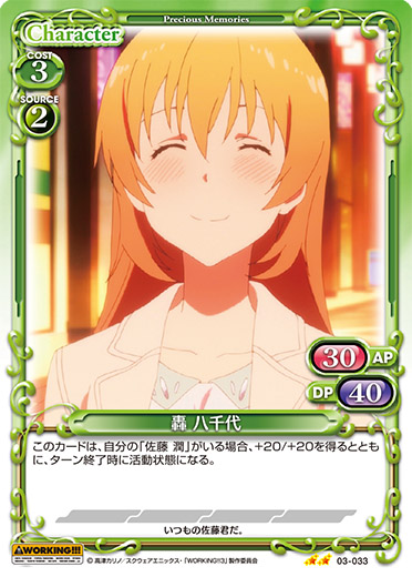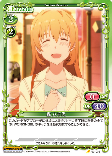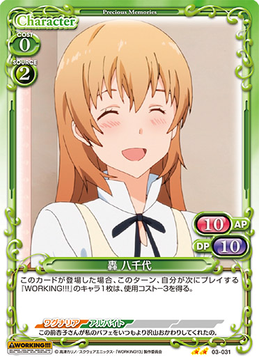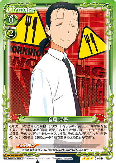 | このカードが登場した場合、このターン、自分が次にプレイする『WORKING!!!』のキャラ1枚は、使用コスト-3を得る。 | ||