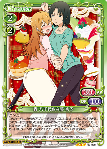 | このカードがアプローチに参加した場合、ターン終了時に自分の全ての『WORKING!!!』のキャラを活動状態にすることができる。 | ||