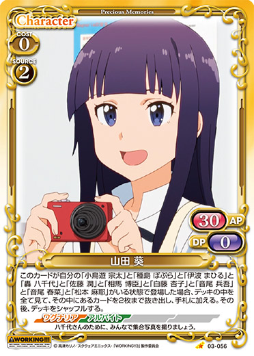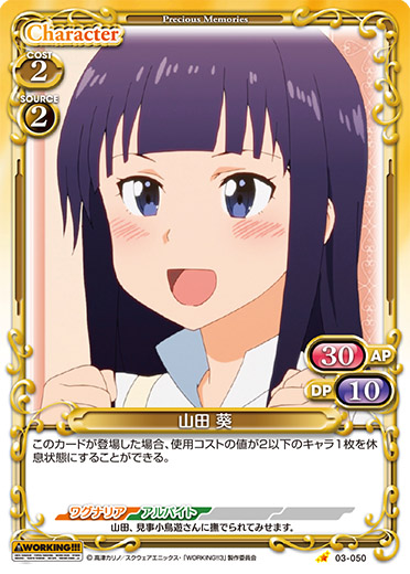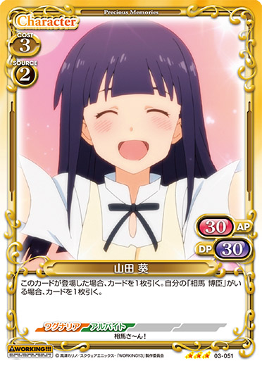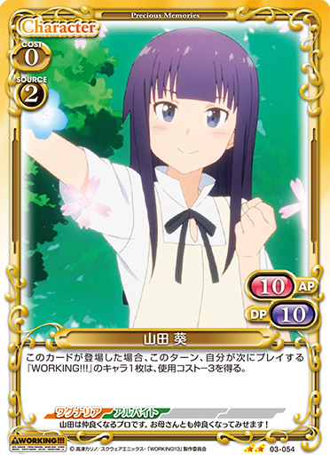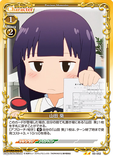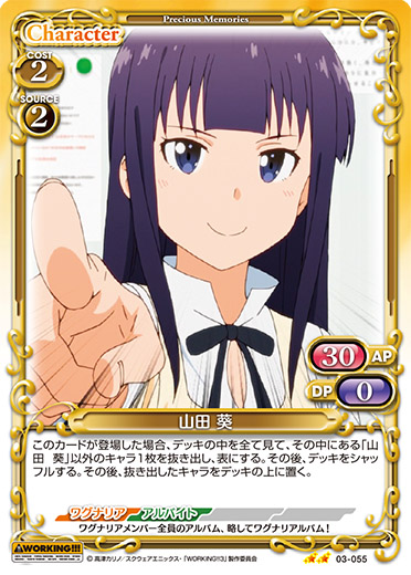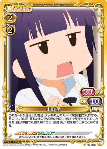 | このカードが退場した場合、デッキの上のカード3枚を捨て札にする。その中に「山田 葵」以外の『WORKING!!!』のキャラが含まれていた場合、自分の捨て札置き場にある「山田 葵」1枚を場に出すことができる。 | ||