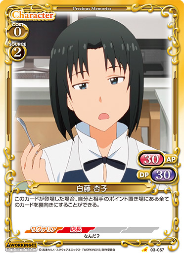 | このカードが登場した場合、このターン、自分が次にプレイする『WORKING!!!』のキャラ1枚は、使用コスト-3を得る。 | ||