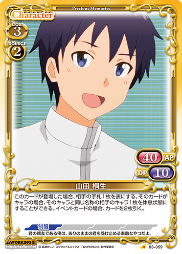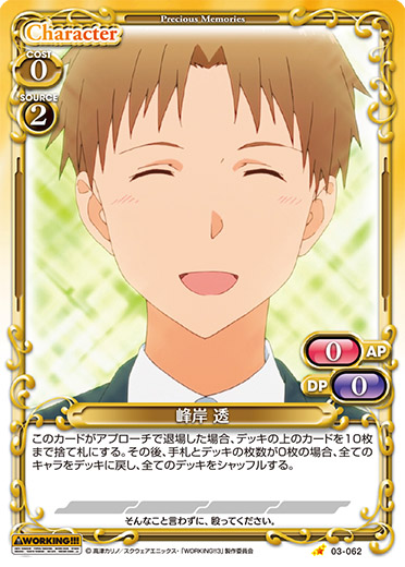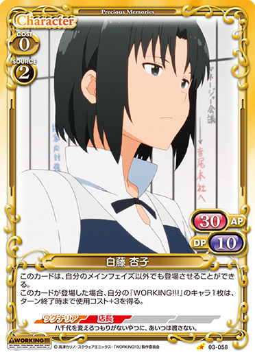 | このカードは、自分のメインフェイズ以外でも登場させることができる。このカードが登場した場合、自分の『WORKING!!!』のキャラ1枚は、ターン終了時まで使用コスト+3を得る。 | ||