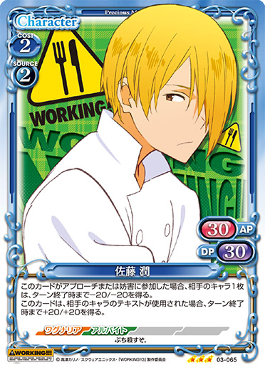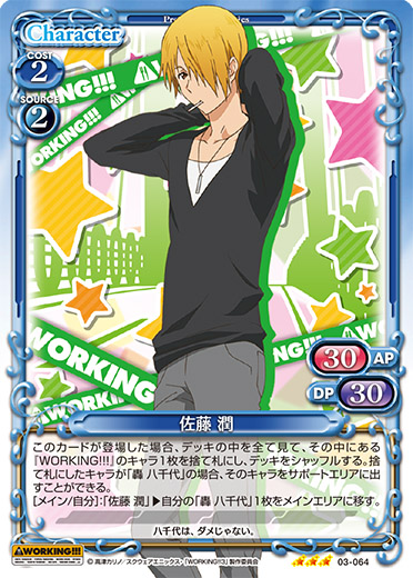 | このカードが登場した場合、カードを3枚引く。その後、手札2枚を捨て札にする。[アプローチ/相手]:「佐藤 潤」▸自分の捨て札置き場にある「佐藤 潤」以外の『WORKING!!!』のキャラ1枚を手札に戻す。 | ||