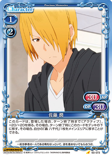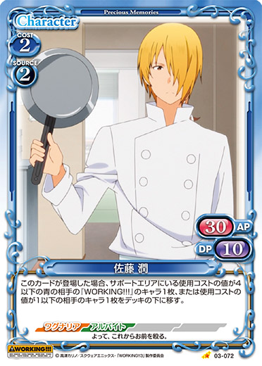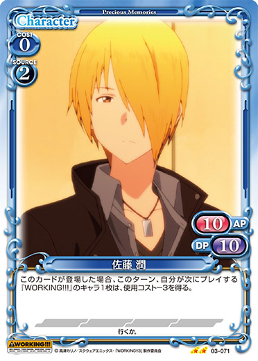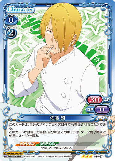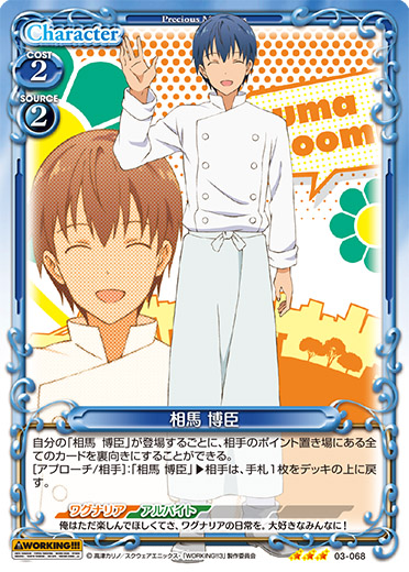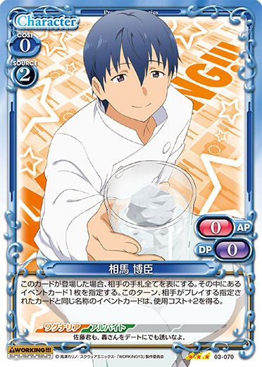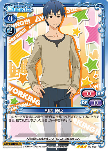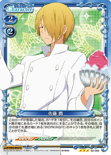 | このカードが登場した場合、このターン、自分が次にプレイする『WORKING!!!』のキャラ1枚は、使用コスト-3を得る。 | ||