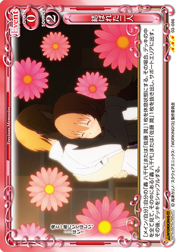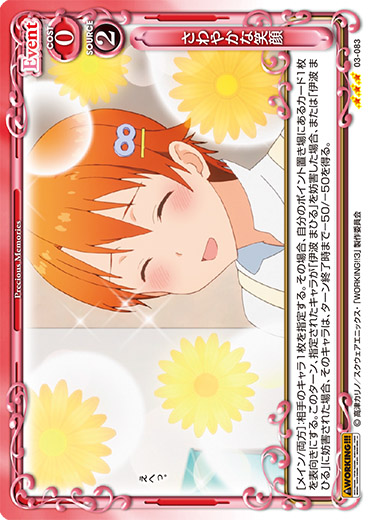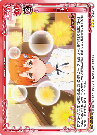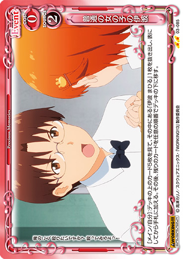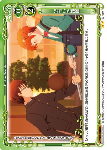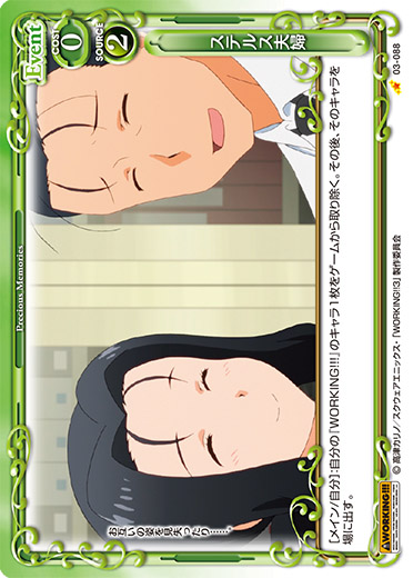 | [メイン/相手]:自分の捨て札置き場にある『WORKING!!!』のキャラ1枚を手札に戻す。 | ||