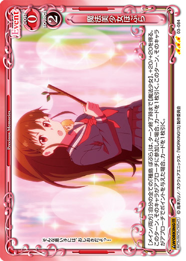 | [メイン/両方]:自分の全ての「種島 ぽぷら」は、ターン終了時まで【魔法少女】、+20/+20を得る。このターン、そのキャラがアプローチに参加した場合、カードを1枚引く。このターン、そのキャラがアプローチでポイントを与えた場合、カードを1枚引く。 | ||