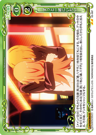 | [メイン/自分]:自分の『WORKING!!!』のキャラ1枚をゲームから取り除く。その後、そのキャラを場に出す。 | ||