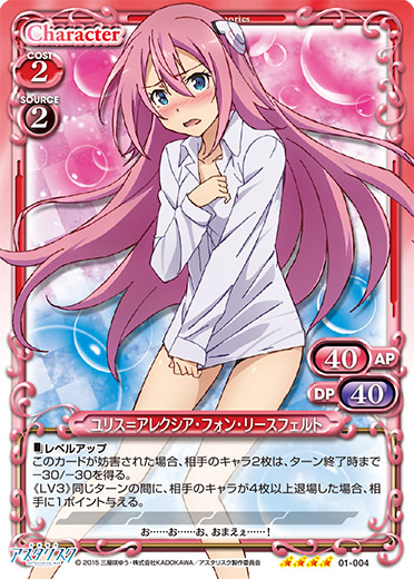 | 自分の「ユリス=アレクシア・フォン・リースフェルト」がレベルアップした場合、カードを1枚引く。自分の「ユリス=アレクシア・フォン・リースフェルト」がレベルアップした場合、そのキャラは、このターン、APまたはDPの値が0の相手のキャラには妨害されない。 | ||