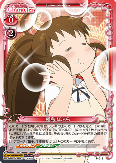 | 〔コンビ〕このカードは、アプローチに参加した場合、このカードと同じ名称の自分のキャラ1枚につき、ターン終了時まで+10/+10を得る。[メイン/両方]:「相馬 博臣」▸このターン、手札にある全ての「山田 葵」は、自分のメインフェイズ以外でも登場させることができる。 | ||
