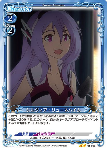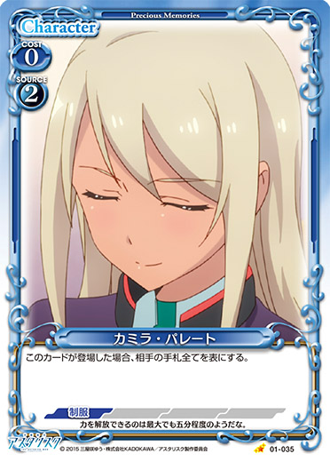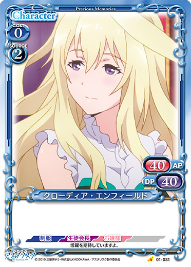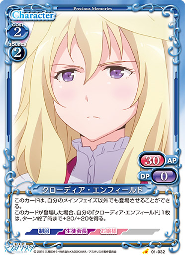 | このカードは、自分のメインフェイズ以外でも登場させることができる。このカードが登場した場合、自分の「クローディア・エンフィールド」1枚は、ターン終了時まで+20/+20を得る。 | ||
