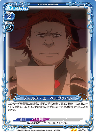 | このカードが登場した場合、デッキの上のカード5枚を見て、その中にあるレベルアップを持つ『学戦都市アスタリスク』のキャラ1枚を抜き出し、表にしてから手札に加える。その後、残りのカードを任意の順番でデッキの下に移す。 | ||