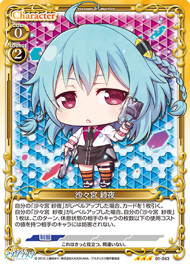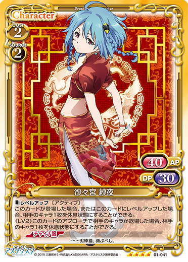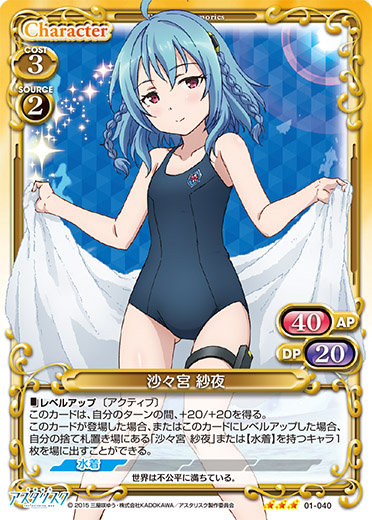 | レベルアップ 〔アクティブ〕このカードは、自分のターンの間、+20/+20を得る。このカードが登場した場合、またはこのカードにレベルアップした場合、自分の捨て札置き場にある「沙々宮 紗夜」または【水着】を持つキャラ1枚を場に出すことができる。 | ||