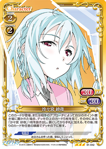 | このカードが登場、または相手のアプローチによって自分のポイント置き場に置かれた場合、デッキの上のカード5枚を見て、その中にある「沙々宮 紗夜」1枚を抜き出し、表にしてから手札に加える。その後、残りのカードを任意の順番でデッキの下に移す。 | ||