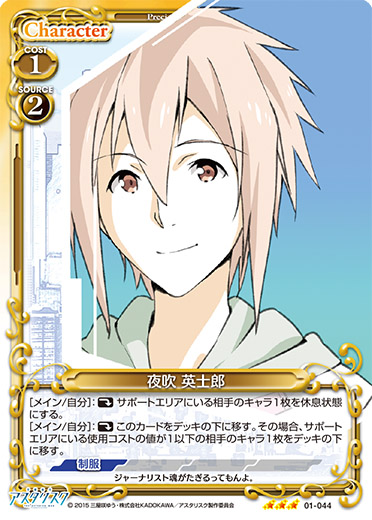 | [メイン/自分]:《休》サポートエリアにいる相手のキャラ1枚を休息状態にする。[メイン/自分]:《休》このカードをデッキの下に移す。その場合、サポートエリアにいる使用コストの値が1以下の相手のキャラ1枚をデッキの下に移す。 | ||