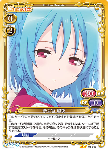 | このカードは、自分のメインフェイズ以外でも登場させることができる。このカードが登場した場合、自分の「沙々宮 紗夜」1枚は、ターン終了時まで使用コスト+3を得る。その場合、そのキャラを活動状態にすることができる。 | ||