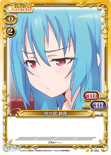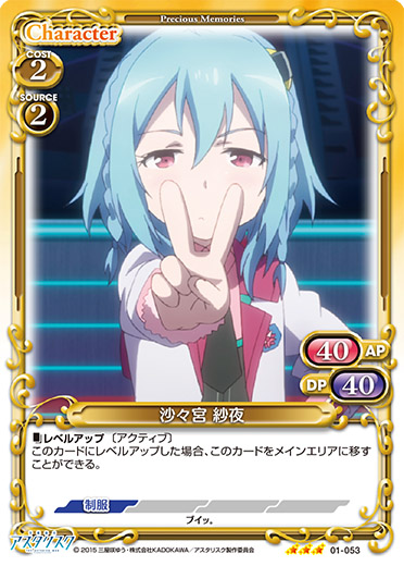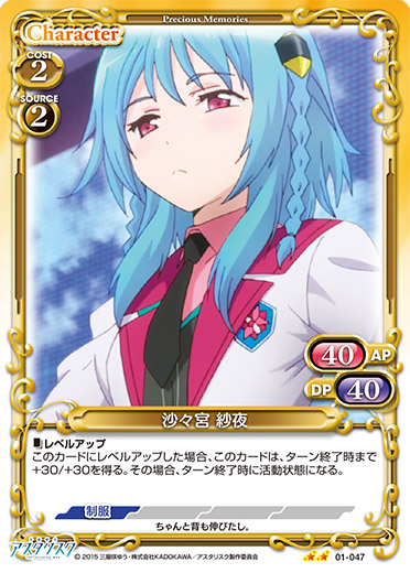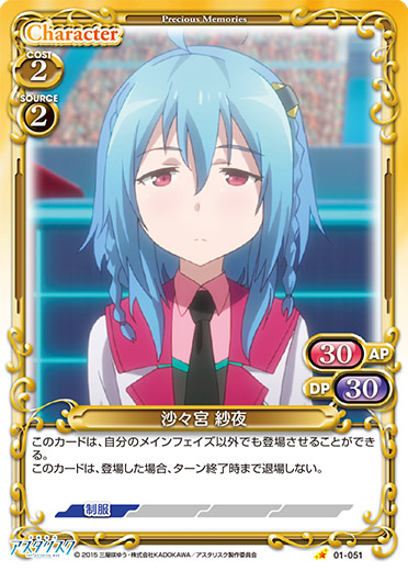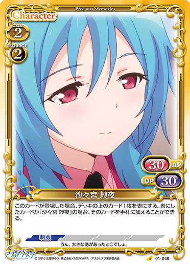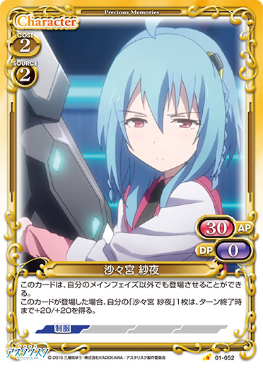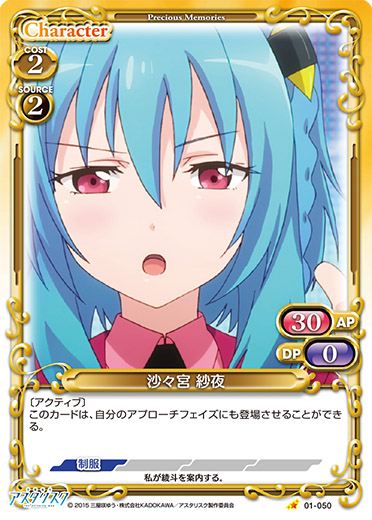 | このカードは、自分のメインフェイズ以外でも登場させることができる。このカードが登場した場合、自分の「沙々宮 紗夜」1枚は、ターン終了時まで+20/+20を得る。 | ||
